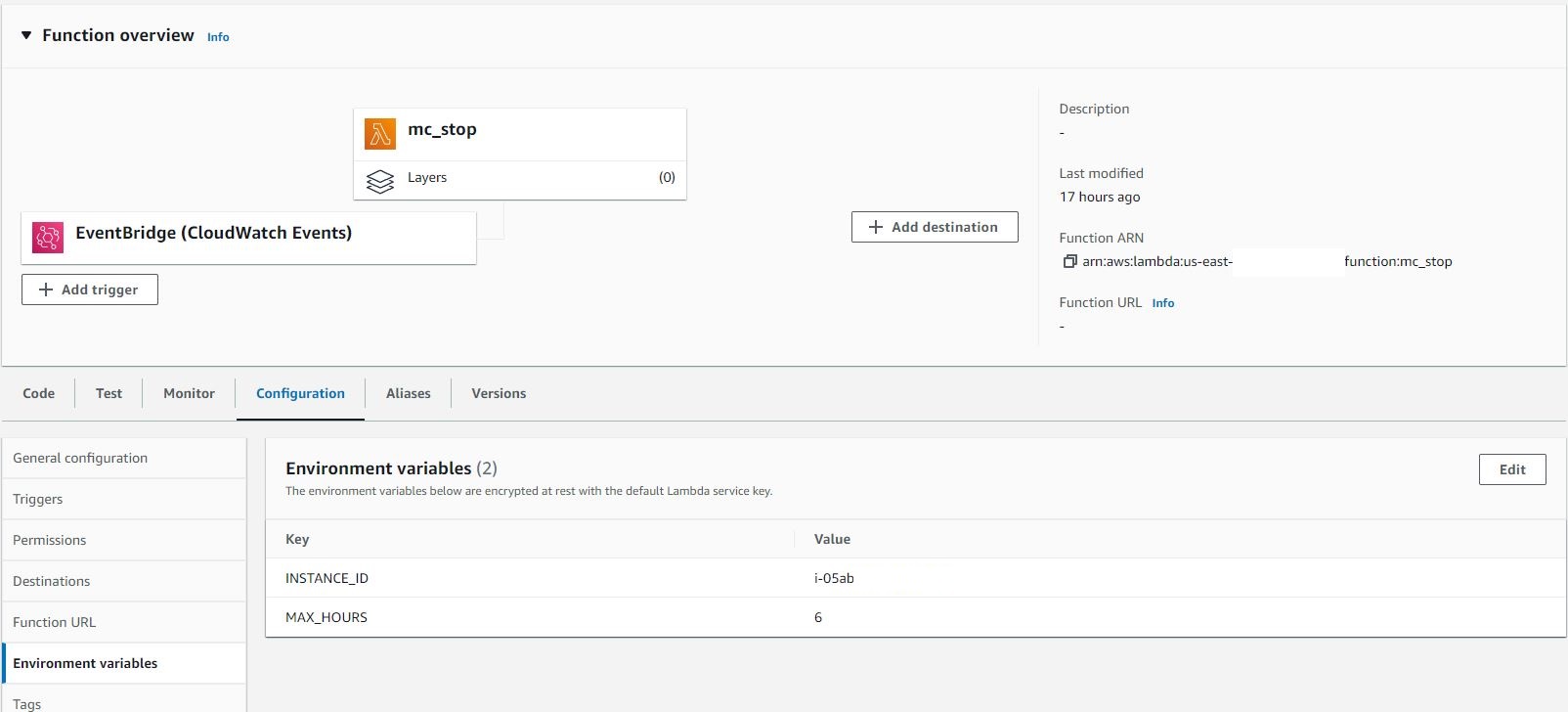 The first two files simply use the AWS APK and force the EC2 instance on or off depending on the function. The third function looks at what time the instance started (assuming it’s running), and figures out if it’s been at least 6 hours. If it has, then it turns it off. For all three of them, you need to go into the function’s Configuration and setup and Environment Variable called “INSTANCE_ID” and set it to the value of your instance. The third function also had a second variable called “MAX_HOURS” where you set the number of hours to wait until you force the server off.