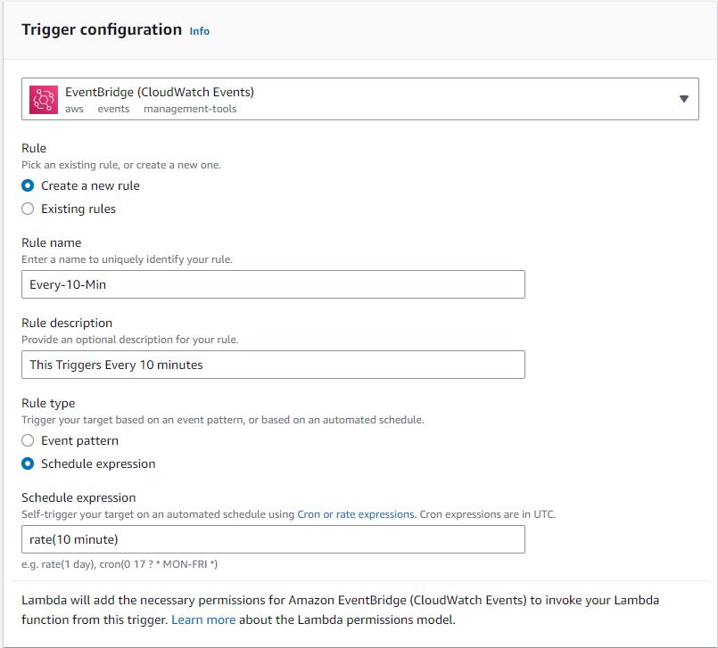 For the 3rd function (shutdown after x hours), I needed to build a trigger to make sure it would run and actually check to see how long it had been running. I wanted the function to run every 10 minutes. To do this, under the functions “Configuration” page, click on “Triggers”, and then “Add Trigger”. Select “EventBridge” and “Create a New Rule”. Give it a name and description, and under “Schedule Expression” set it to rate(10 minutes).