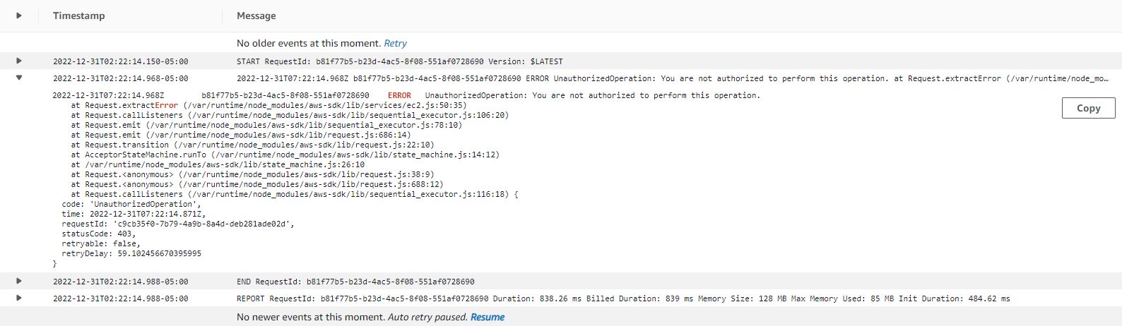 OK, so I see the part about not having authorization to do this. I forgot, the Lambda functions need to have permission to manage the EC2 instances. I jump over to IAM and create a new policy that gives permission to start and stop instances as well as “describe” them (find out what time it started at.). You can see the policy below: