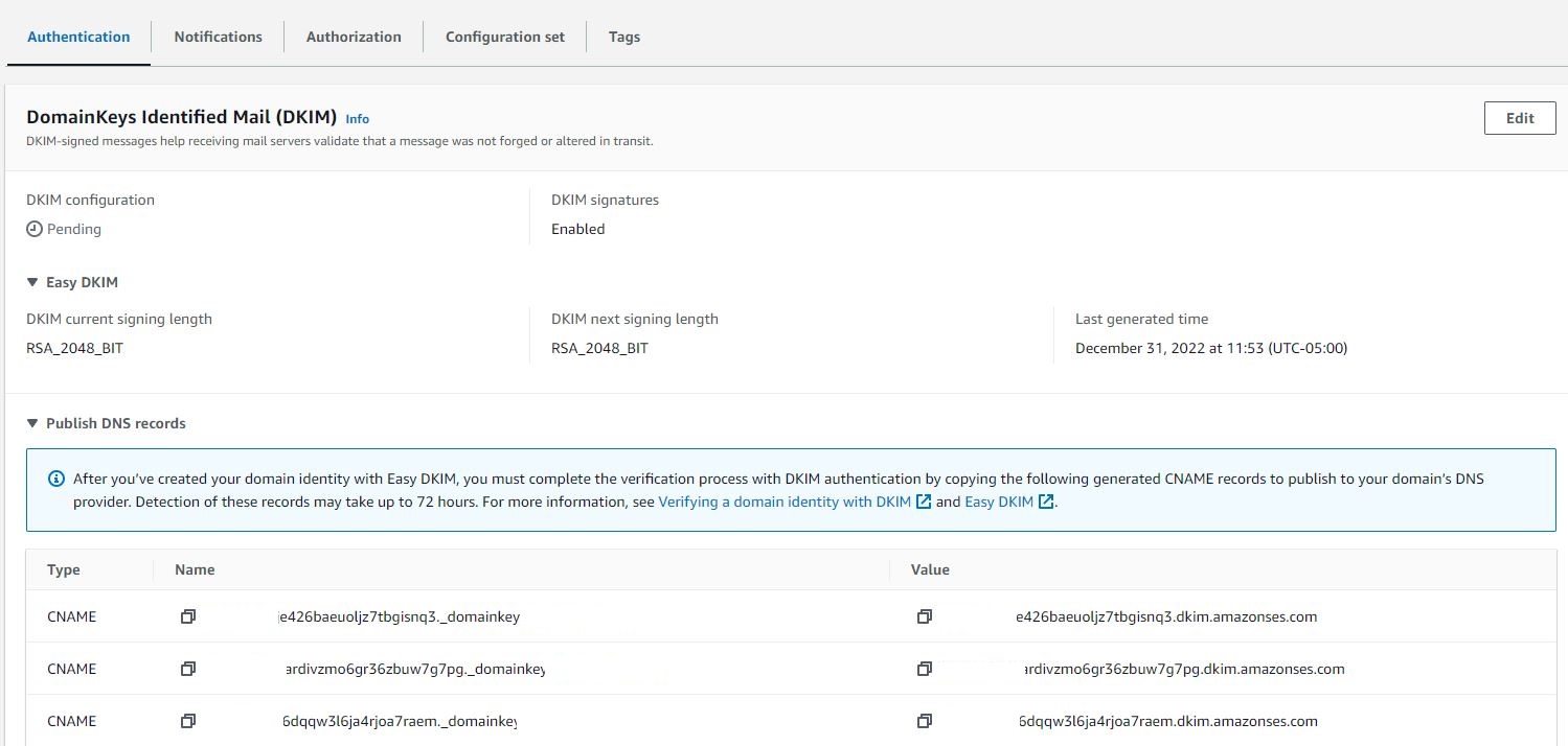 Before you can use it with SES, you must verify it. To do that, you must have DKIM configured, which is not something I had ever done before. Fortunately, AWS made it pretty easy. Go into SES and click on “Verified Identities” and create a new one. Under “Verifying Your Domain”, click on “Easy DKIM” and then “RSA_2048_BIT”. It creates the DKIM keys required and then gives you the CNAM records you need to add to your DNS registration. Wait a little bit of time, and eventually AWS will see the updates to DNS and consider the address to be verified.
